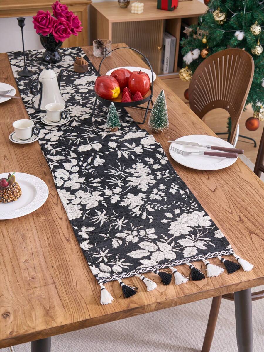 1 buc. Față de masă jacquard cu ciucuri și motive florale negre, față de masă dreptunghiulară în stil vintage american rustic, potrivită pentru zi cu zi, sărbători, reuniuni de familie, nunți, banchete, decorațiuni interioare, consumabile hoteliere de înaltă calitate, ceai de după-amiază