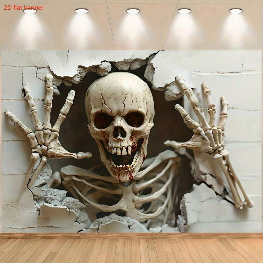 Banner plat 2D, 1 bucată de schelet care sparge peretele, ținând peretele cu ambele mâini, cu pânză de fundal cu sânge și crăpături, creând o atmosferă de groază terifiantă și realistă, perfect pentru decorațiuni de Halloween și evenimente cu tematică de groază, cadouri de sărbători, decorațiuni pentru casă, recuzită de studio, petreceri de tailgating.