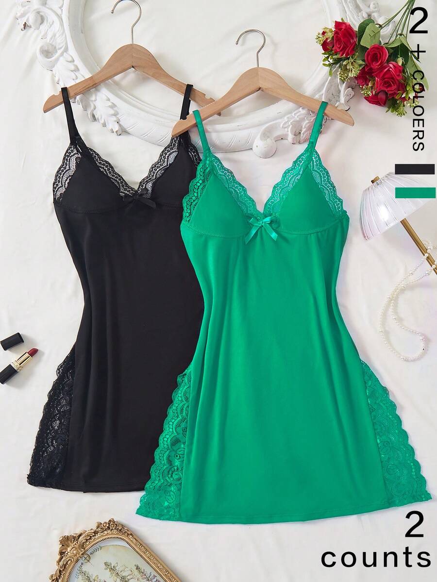 Cămașă de noapte romantică cu crăpături laterale și dantelă, model patchwork, 2 buc.
