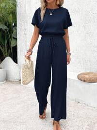 CoeurvaFranclia Set 2 buc. pentru femei, casual, culoare solidă, alb-negru, tiv contrastant, mâneci cu volane, decor cu nasturi, bluză contrastantă cu deschizătură în față și pantaloni largi de culoare solidă, moi și confortabili, potriviti pentru toamnă/iarnă/primăvară, stil elegant francez pentru purtare zilnică.