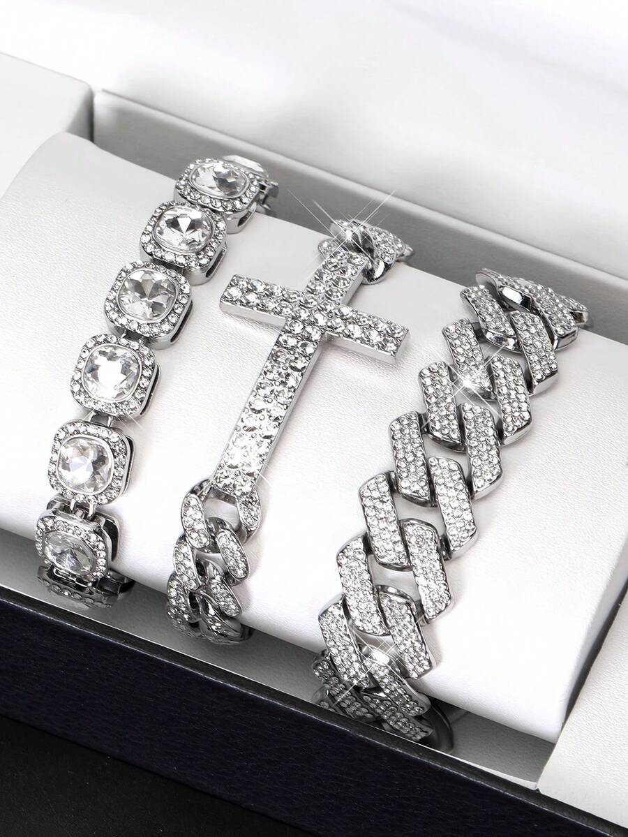 3 buc/set brățară cu pandantiv cruce Ice Out rotundă cu lanț Tenniers și brățară cubaneză Miami Set pentru tânăr bărbat și femeie cubaneză lanț cruce punk set de brățări cu pandantiv Unisex cadou pentru bărbați și femei potrivit pentru zi cu zi și petrecere