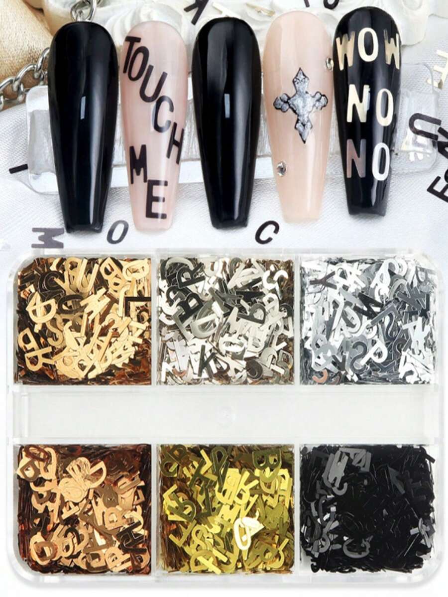 Cutie cu 6 grile, 26 paiete cu alfabetul englez, culoare metalică, 6 mm, personalizate, sclipici, paiete PET, rășină, decor DIY