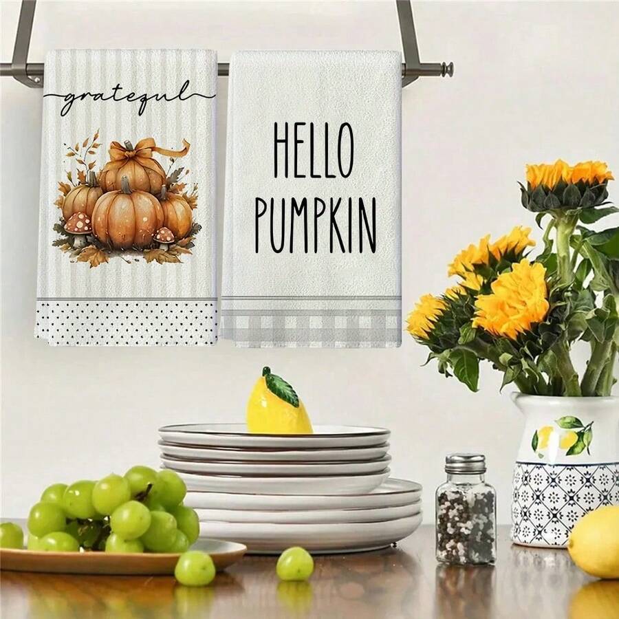 Un set de 2 bucăți de prosoape cu tematică de toamnă de Ziua Recunoștinței, concepute cu prosoape imprimate cu model de dovleac și frunze de arțar, lavabile la mașină, rezistente la căldură, absorbante și reutilizabile, potrivite pentru decorarea camerei, prosoape de bucătărie și baie, decorarea petrecerilor, decorarea casei, fiind un cadou ideal pentru toamnă și Ziua Recunoștinței.