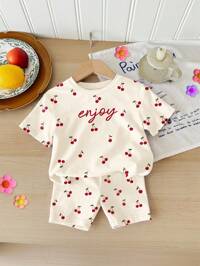 SHEIN Alb crem, drăguț mini cireșe, model simplu cu litere dulci, set de tricou și pantaloni scurți cu guler rotund, lejer, casual, cu mânecă scurtă, pentru bebeluși, potrivit pentru acasă, ieșiri, filmări stradale, picnic, activități în aer liber, vacanță, înapoi la școală, ținute de vară pentru, confort ușor, straturi de toamnă pentru fetițe, fetițe elegante, ținute casual, haine grafice pentru fetițe, înapoi la școală, ținută de toamnă cu imprimeu cireșe pentru bebeluși, set de haine pentru bebeluși, pijamale de vară pentru bebeluși, seturi casual pentru bebeluși, ținută pentru bebeluși cu imprimeu cireșe.