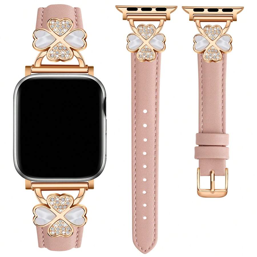 Curea din piele compatibilă cu 38mm 40mm 41mm 42mm 44mm 45mm 46mm 49mm pentru femei – Ultra-subțire, rafinată, rezistentă la transpirație, confortabilă – Simplă, elegantă, la modă – Design cu diamant și trifoi cu patru foi – Compatibilă cu Series 10, 9, Ultra SE, 8, 7, 6, 5, 4, 3, 2, 1 – Accesorii pentru curea de schimb