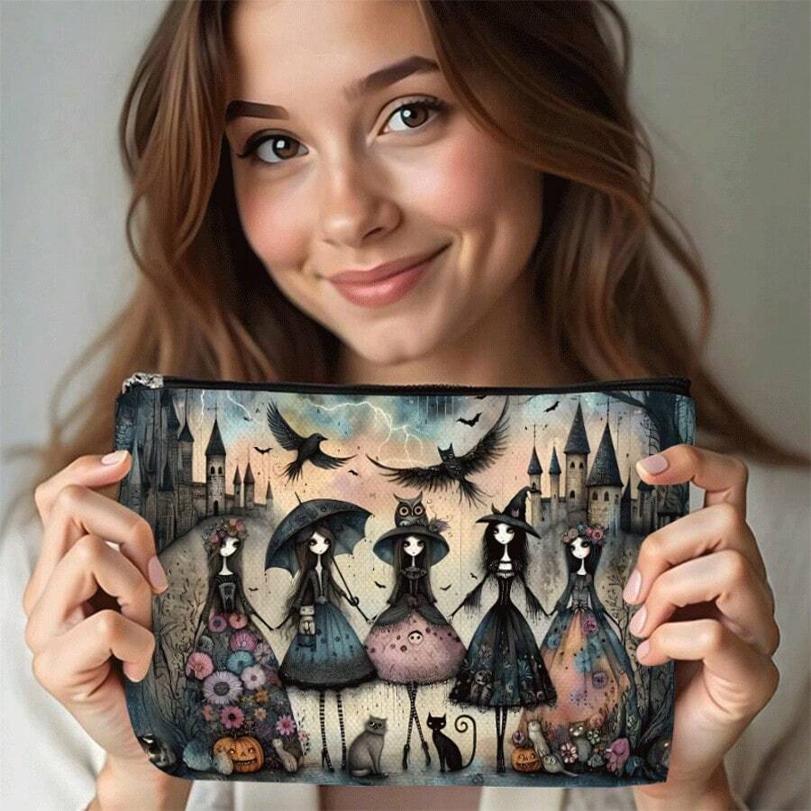 Geantă de machiaj gotică multifuncțională – cu modele de vrăjitoare, pisică neagră și bufniță, geantă de călătorie portabilă din pânză, ideală pentru călătorii, gustări, monede, cu model elegant de castel, cadou perfect pentru surori