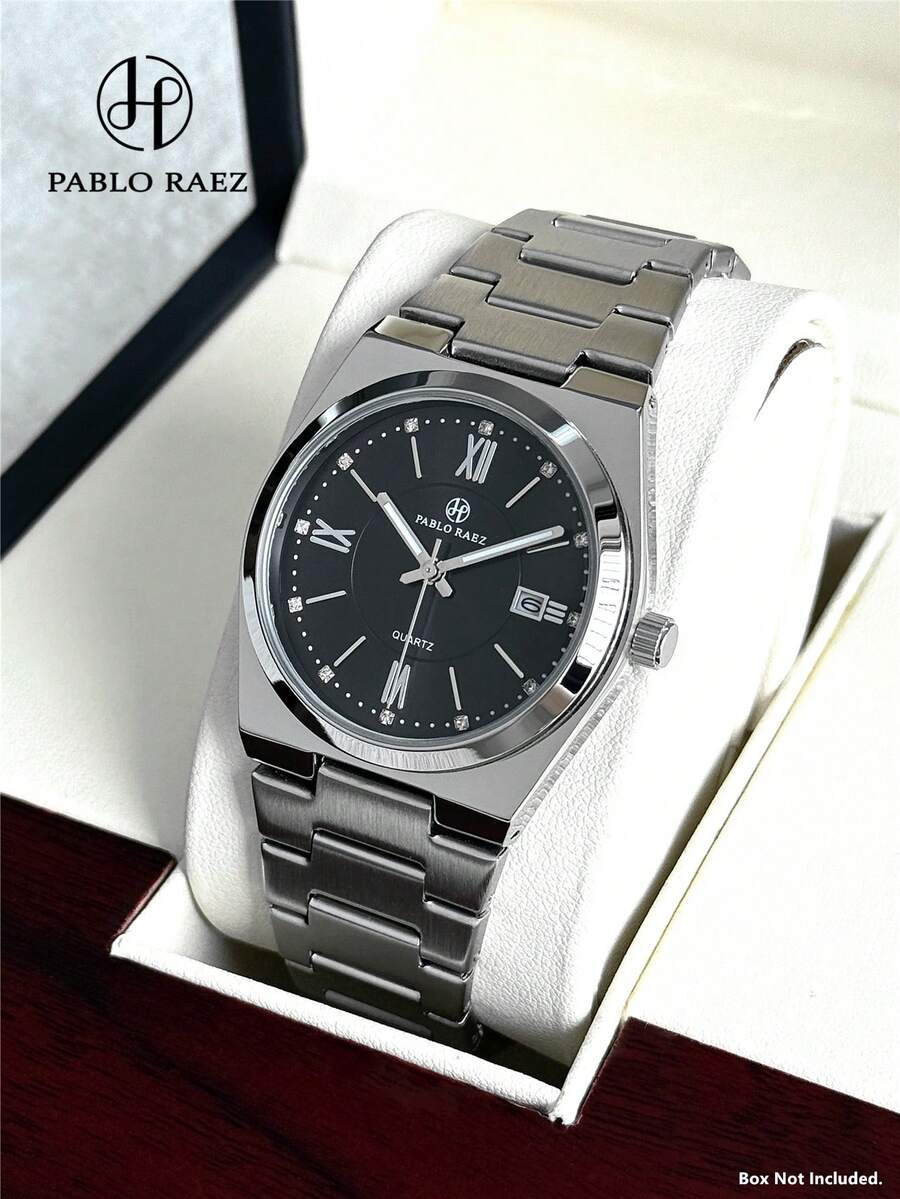 Pablo Raez 1 buc Ceas de afaceri pentru bărbați, din oțel inoxidabil, bijuterii pentru bărbați, ceas de mână original, brățări din oțel greu, lanț, argintiu, culoare non-oxidantă, fermecător, faimos, design nou-nouț, lux, culoare alb-negru, rezistent la apă 50M, ceas simplu cu afișaj calendaristic, ceas casual pentru bărbați, cuarț, modă