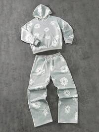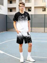 BoltySHEIN 2 buc. Tricou și pantaloni scurți pentru băieți adolescent, în stil de stradă, retro, trandafir roșu și pace, cu model grafic englezesc, tricotat negru, vintage, largi, cu mânecă scurtă, potrivite pentru vară, pentru ieșiri. Îmbrăcăminte de primăvară.