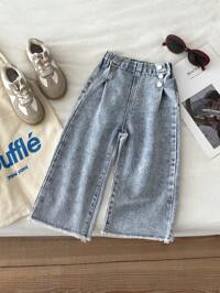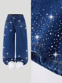 Genkimix KidsSHEIN Explorewe Blugi pentru fete tinere, albastru-spălare medie, stil stradal casual, vacanță, design Y2K, talie elastică neregulată, buzunare simple, decorațiuni cu nasturi cu capse, strasuri, picior drept lejer, denim moale din bumbac, neelastic, potriviți pentru purtare zilnică, naveta, ieșiri în oraș, petreceri, nou-veniți toamnă/iarnă
