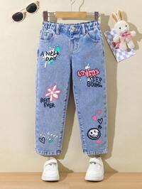 Elladie kidsSHEIN Elladie kids Blugi în stil Y2K pentru fete tinere, pantaloni noi la modă, din denim, brodați cu inimă albă, vintage, albastru mediu, spălați, cu picior drept, lejer, material moale și confortabil, ținute casual versatile de stradă, blugi pentru fete
