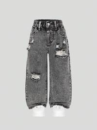 SUNSHNE KidsBlugi eleganți pentru fete tinere, spălați deschis, cu aspect uzat, cu fundă întinsă, talie înaltă, largi, cu picior drept, cu inserție de buzunar, perlă artificială și tiv zdrențuit, pentru festivaluri de vacanță de primăvară și vară, blugi cu picior larg, stil boho pentru plajă de vară, Anul Nou, blugi de Crăciun pentru Revelion, streetwear vintage, confortabili și versatili