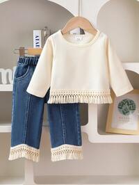 Playful PalsSHEIN Playful Pals Set tricouri casual pentru fete tinere, tricou cu mânecă lungă, design neregulat, guler înalt, tricotat, material fleece, culoare solidă, bej, asortat cu pantaloni evazați casual bej, set din 2 piese, potrivit pentru primăvară, toamnă, iarnă, întoarcerea la școală, ținute elegante de zi cu zi pentru femei, ieșiri, călătorii, întâlniri